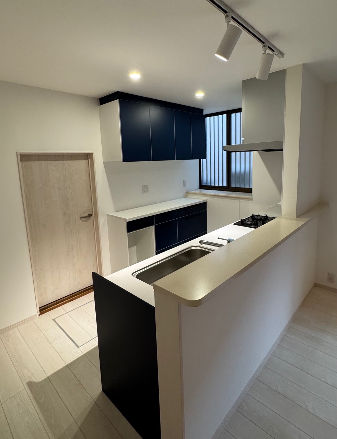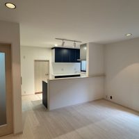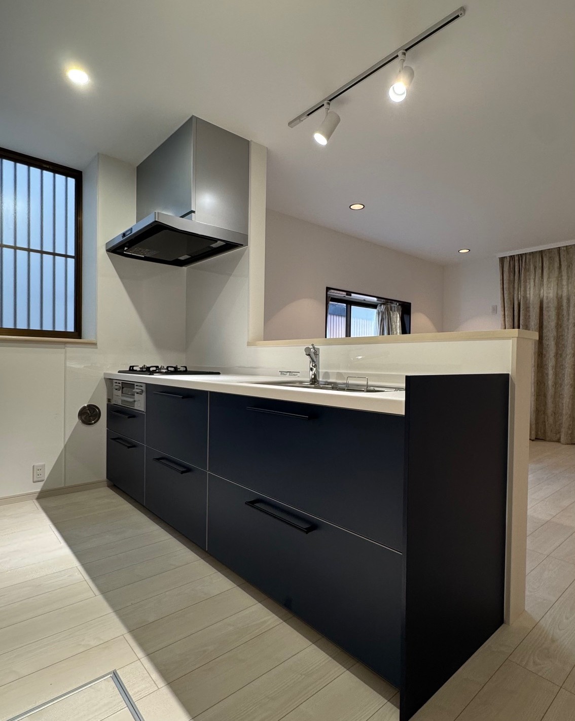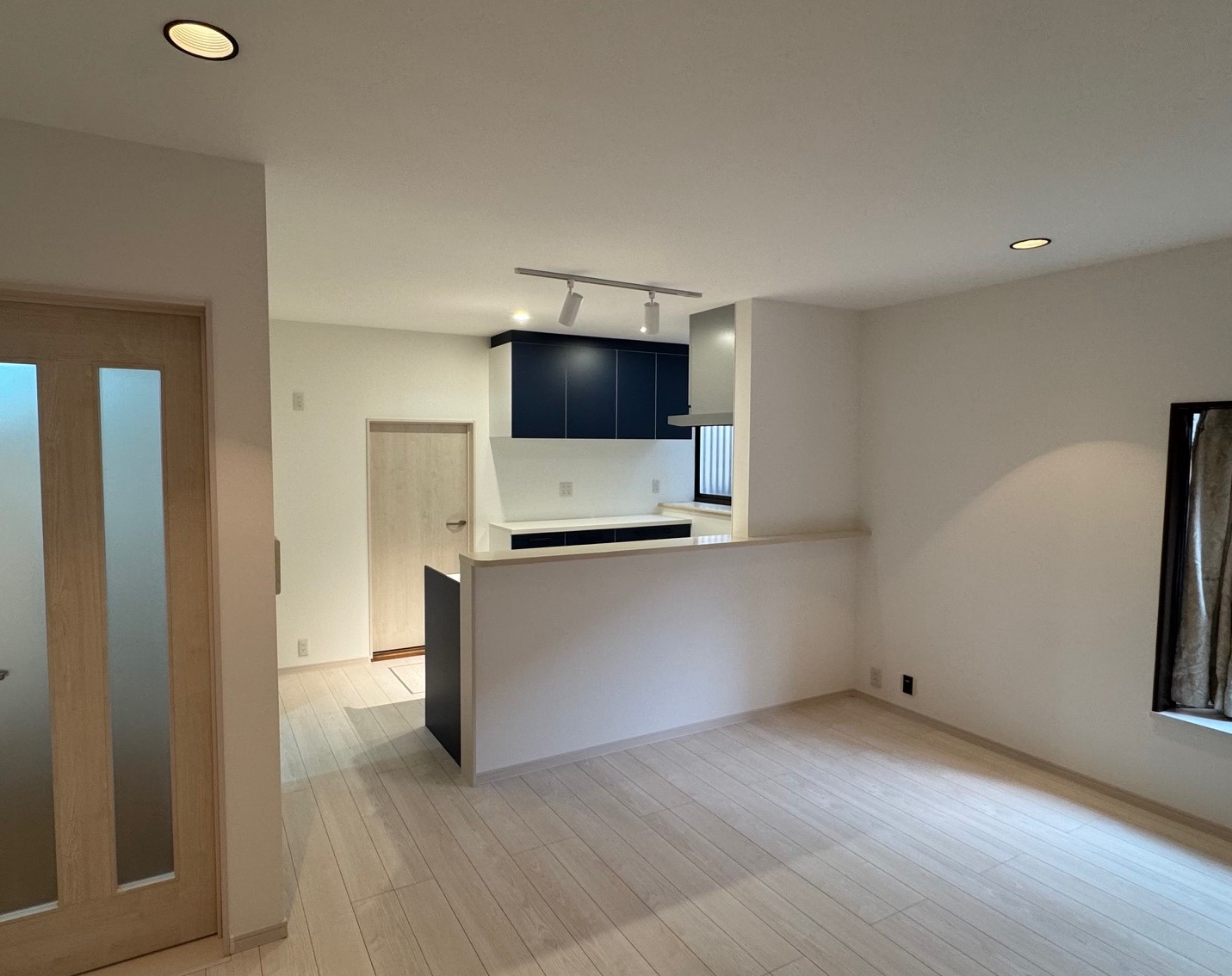 吊り戸がなく、レール式のスポットライトを採用されたので開放感溢れるLDKになりました。